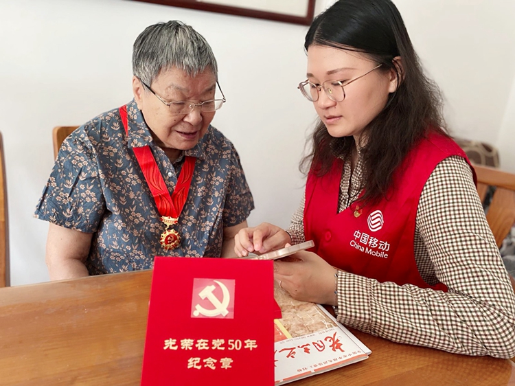 家住常州市天宁街道青山湾社区的郭奶奶,是一位拥有67年党龄的90岁高龄老人,也是“光荣在党50年”纪念章的获得者。重阳节前,常州移动组织党员志愿者上门对郭奶奶进行慰问,陪郭奶奶拉家常,详细了解老人的身体状况和生活情况,感谢郭奶奶为常州建设发展做出的贡献,并送上节日祝福。党员志愿者还在郭奶奶家开起了智能手机“小课堂”,指导老人使用智能手机看照片、发微信等,让老人享受到数字生活的美好便捷,老人不时展露笑颜。