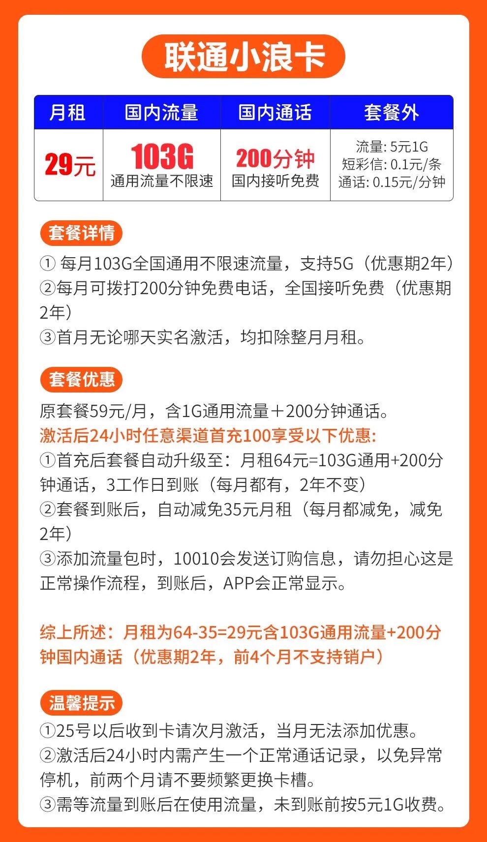 综上所述:月租为64-35=29元含103G通用流量+200分