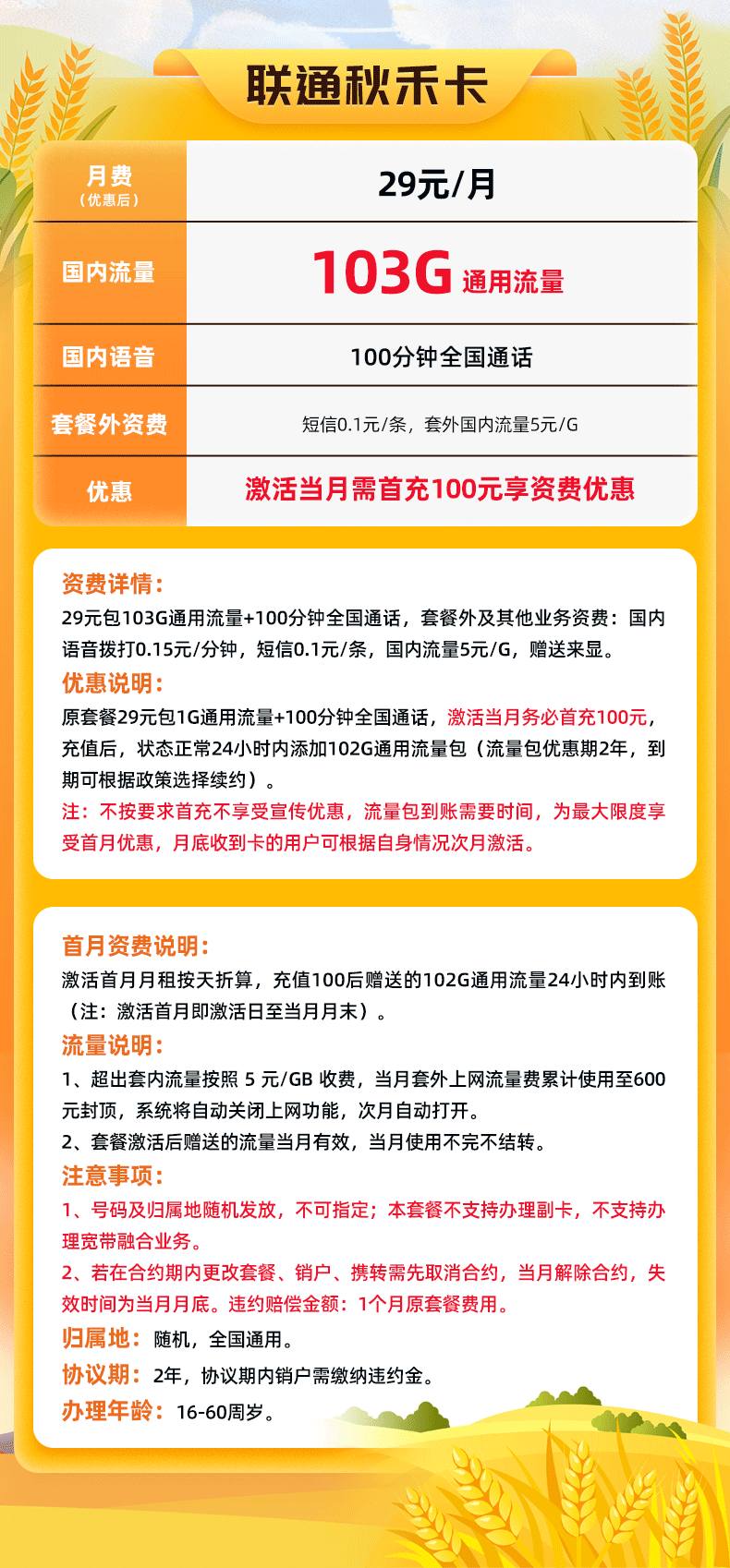 以上就是“联通秋禾卡29元103G”的全部介绍。