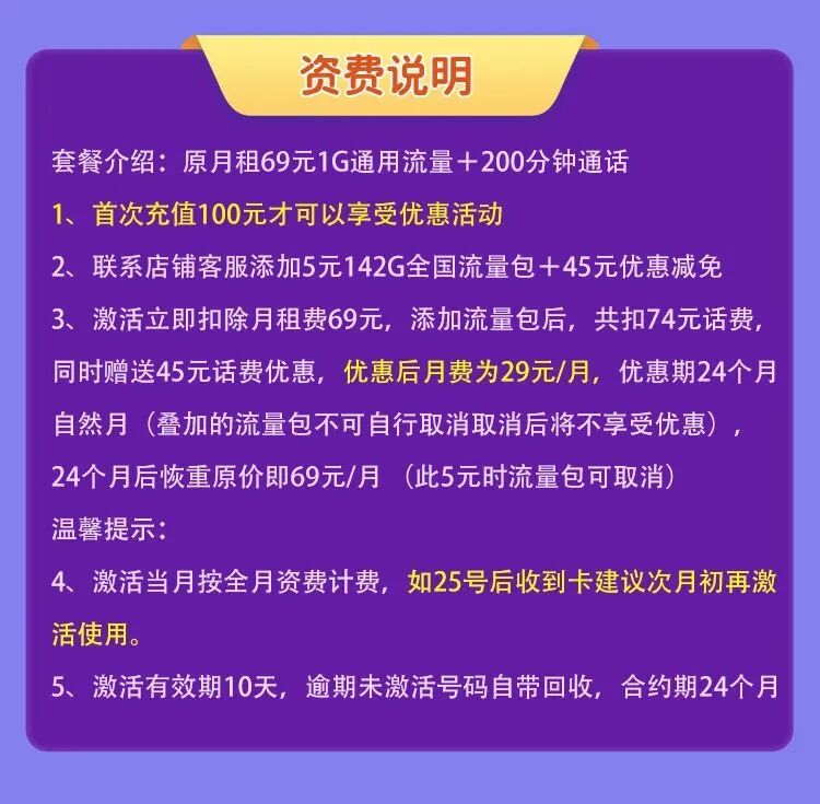 5、激活有效期10天,逾期未激活号码自带回收,合约期24个月