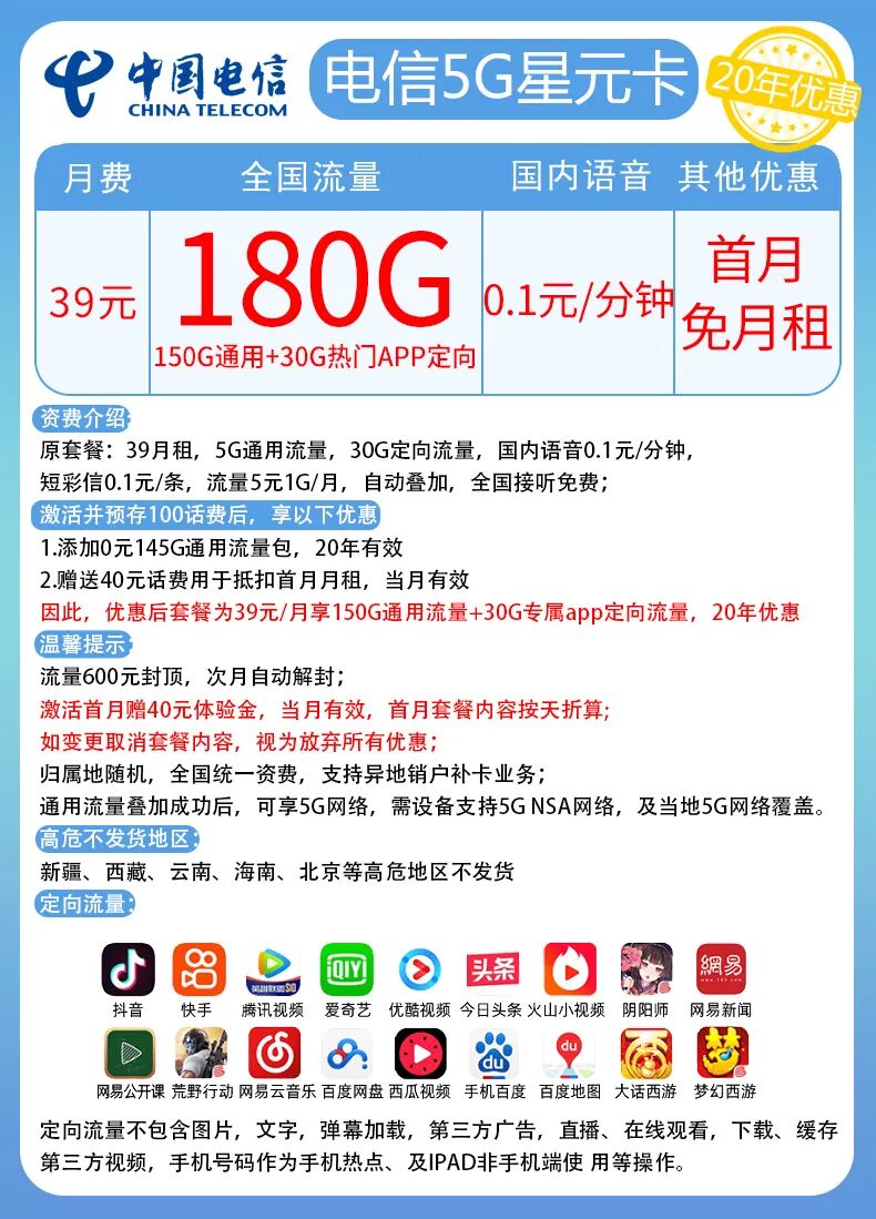 简介:电信5G星元卡39元180G流量(150G通用流量+30G定向流量),支持5G网络,长期套餐,可选号(收到卡激活的时候选号)