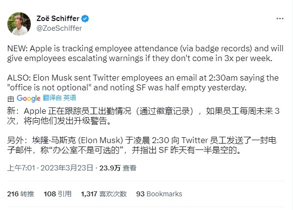 从 Schiffer 的推文内容了解到,如果苹果员工在 1 周时间没有达到出勤 3 天的最低标准,那么就会发出“增强警告”(escalating warnings)。