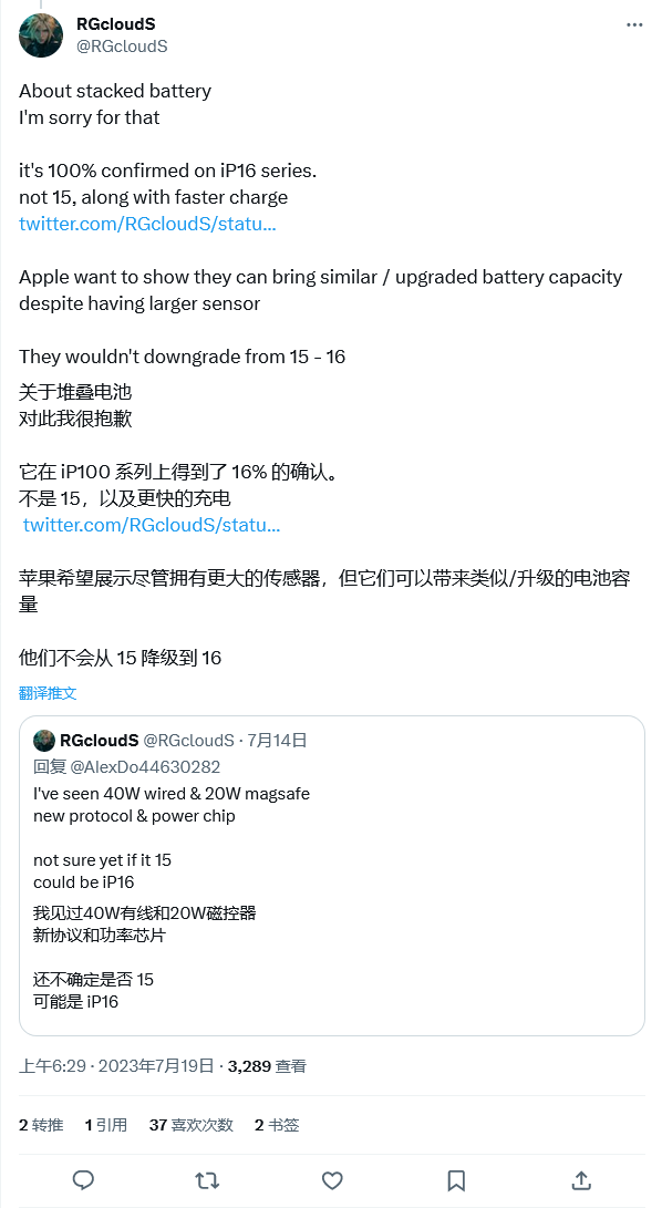 RGcloudS 此前透露 iPhone 15 系列将会采用汽车领域的叠片式电池技术,不仅具备拥有更高能量密度,而且更加安全,不过在最新推文中表示,该技术推迟到 iPhone 16 系列了。