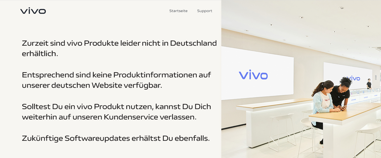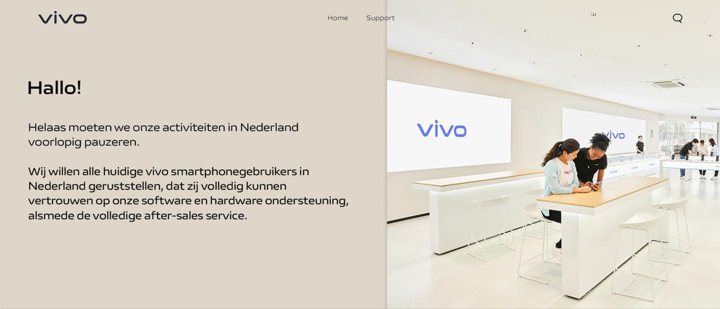 vivo 在荷兰官网发布公告,宣布暂停在荷兰的销售服务,但用户仍然可以获得的系统升级以及售后服务。