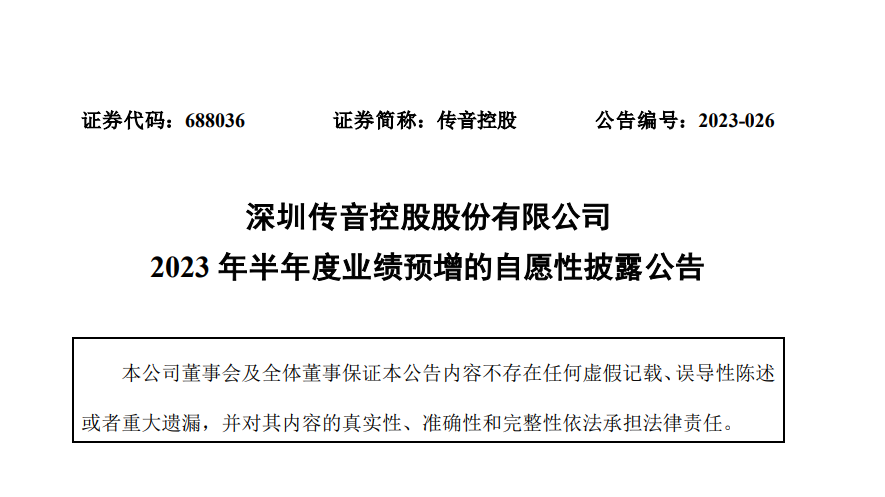 传音控股于今日公布了 2023 年半年度业绩预增的自愿性披露公告,上半年净利同比预增 27.1% 左右。