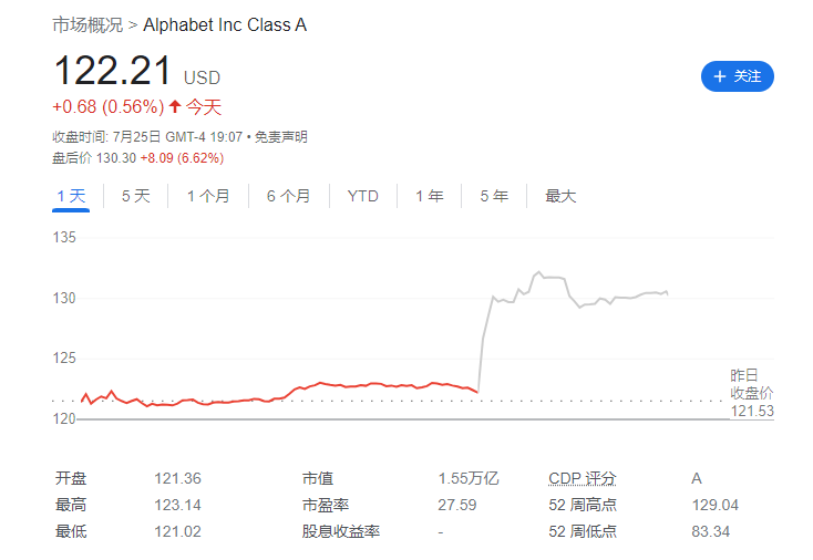 在随后截至美国东部时间周二下午 5 点 46 分(北京时间周三凌晨 5 点 46 分)的盘后交易中,Alphabet 股价再度上涨 7.25 美元,至 130.04 美元,涨幅为 5.90%,突破 52 周最高价。