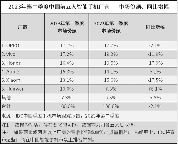 2023年7月27日,国际数据公司(IDC)发布的最新数据显示,2023年第二季度,中国智能手机市场出货量约6570万台,同比下降2.1%。上半年出货量约1.3亿台,同比下降7.4%。OPPO以17.7%的市场份额在第二季度保持国内手机市场第一。根据IDC发布的2023年第一季度数据显示,OPPO成为上半年中国手机市场份额第一。