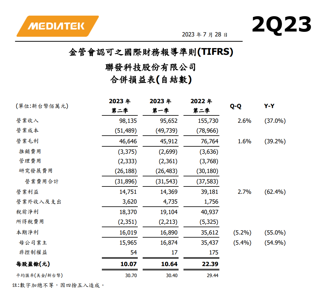 联发科(MediaTec)7月28日公布了截至6月30日的2023年第二季度财报。该季度营收981.35亿元新台币(单位下同,约合223.57亿元人民币),环比增2.6%,同比减少37%;毛利466.46亿元,环比增加1.6%,同比减少39.2%;毛利率为47.6%。本季度毛利率相较一季度以及去年同期略有降低,主要反映了产品价格和成本上的变动。