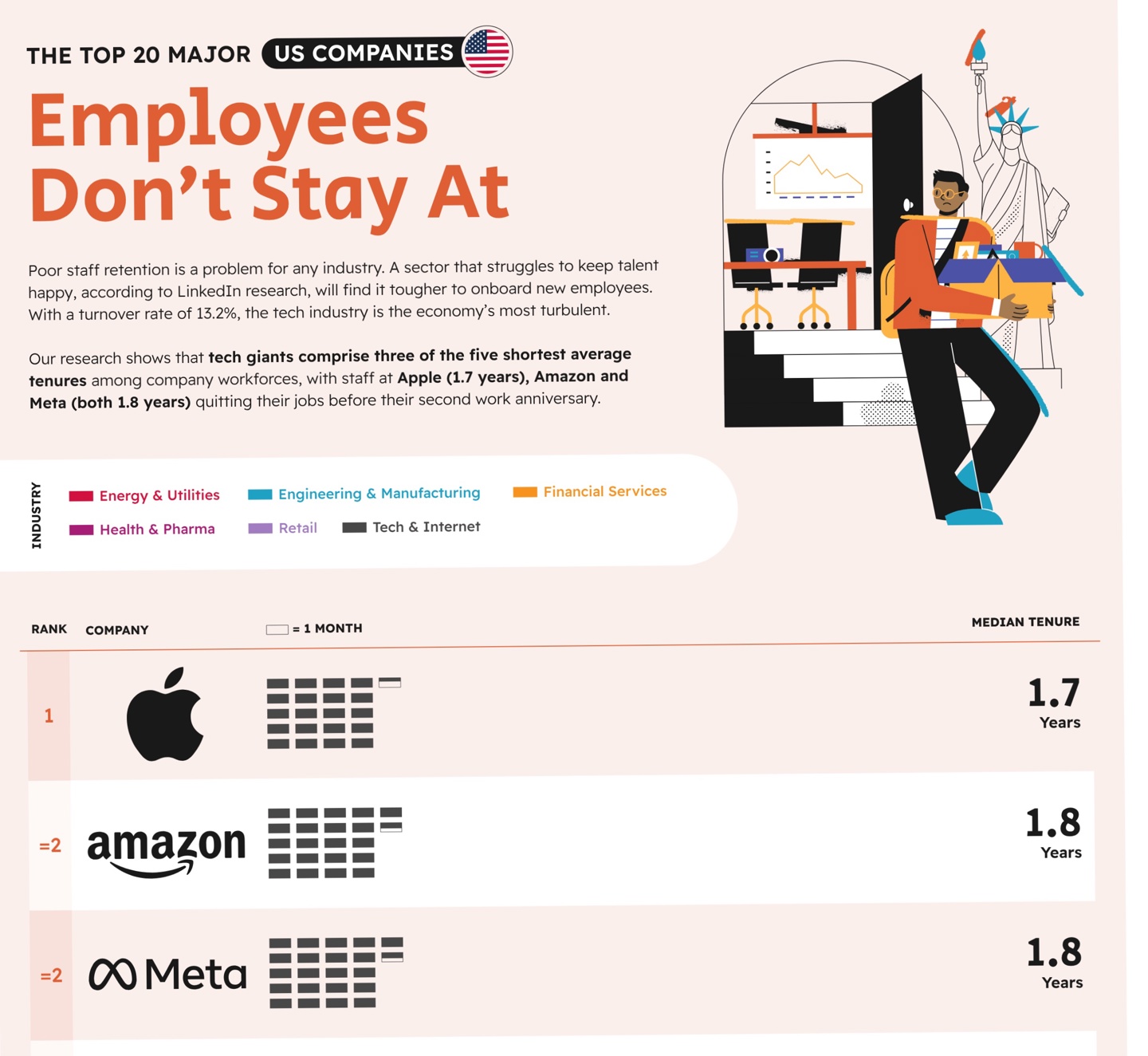 研究报告称苹果公司的员工平均 1.7 年就会跳槽;亚马逊和 Meta 的员工平均 1.8 年就跳槽;特斯拉则是 2 年时间。