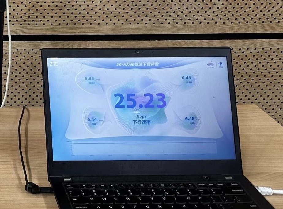 在媒体接待现场,实时测试了下行单小区峰值速率,测试结果稳定在25Gbps以上,并首次实现基于商用终端的商用业务验证。在现场进行了8K视频直播演示,8K摄像头部署在滨江羽毛球馆内,媒体们现场观看了实时回传画面并与羽毛球馆的同事进行互动。