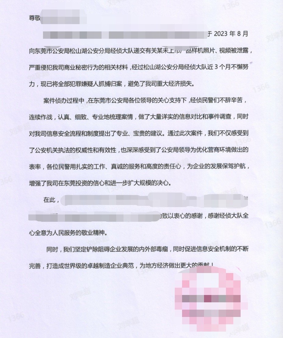 8 月,松山湖公安分局经济侦查大队收到某企业递交的材料,显示该企业生产的全球性未上市的样机被泄露了实物照片及视频。该未上市产品属某知名品牌,商业秘密被泄露所造成的影响不可估量。