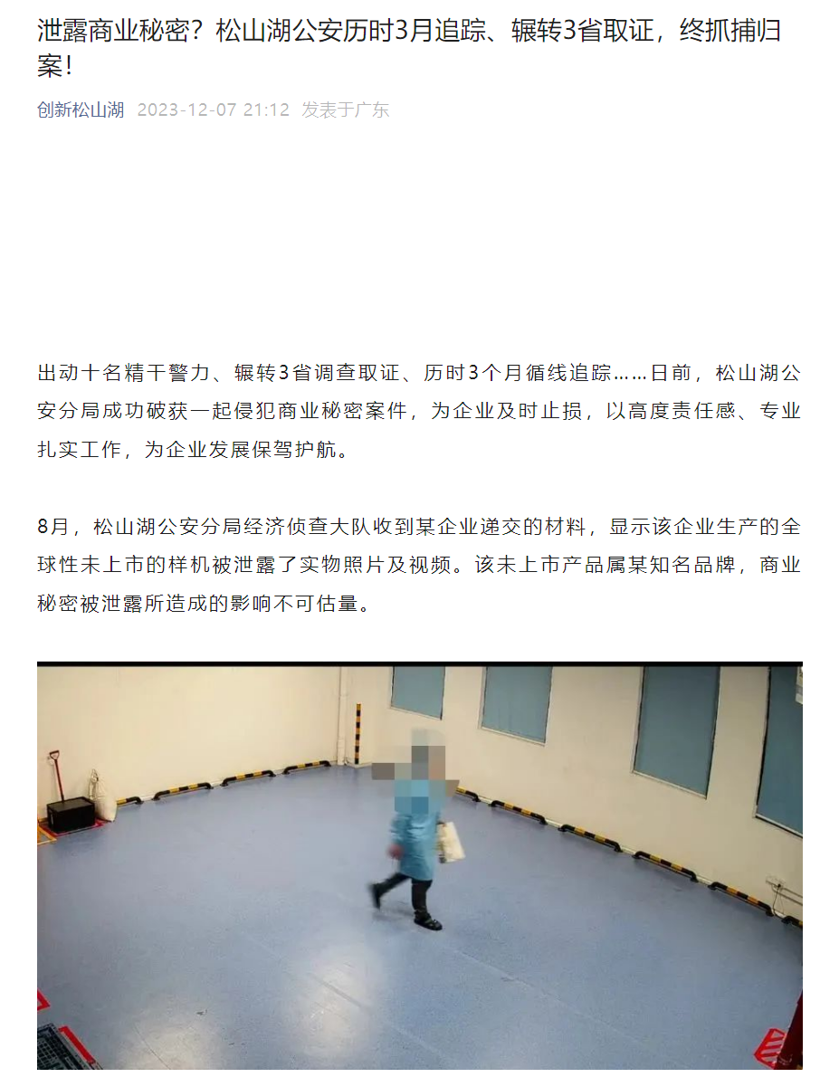 据创新松山湖公众号消息,松山湖公安分局日前成功破获一起侵犯商业秘密案件。
