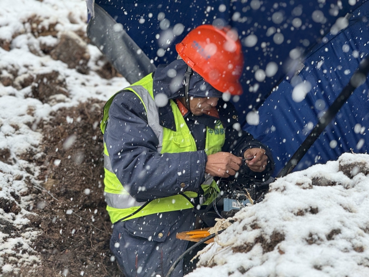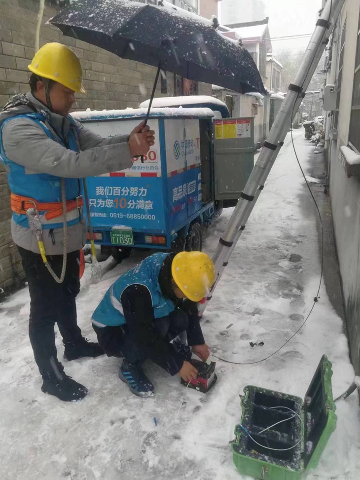 随时待命、及时抢险。12月18日9时28分,常州市武进区雪堰镇潘村突发光缆故障,对周边住户日常通信及企业业务往来造成影响。常州移动迅速组织保障人员应急抢修。现场积雪已达10厘米,积雪的覆盖让光缆断点定位难度“升级”。常州移动保障人员谈春波通过技术手段进行大致定位后,仍有3公里左右的光缆长度需要人工摸查。由于地面已有冰冻,车辆无法行驶,谈春波只得顶着严寒、冒着暴雪徒步沿着线路一点一点摸查断点。在找到断点后又迎来了熔纤考验。光纤细若发丝,稍有不慎,就可能会浪费两段光纤。漫天风雪中,谈春波拉低衣服帽檐以防雪花飘进眼里遮挡视线,并不时朝着冻僵的双手呵气,确保精细地完成断点熔接工作。历经4.5个小时,终于完成了光缆修复并通过了光路测试,恢复了周边通信。