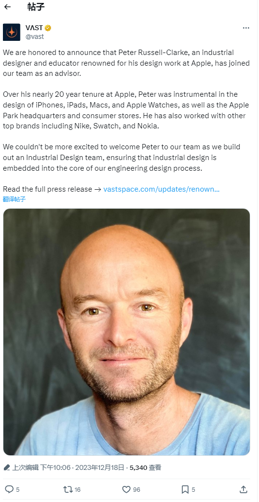 根据彭博社报道,彼得 拉塞尔-克拉克(Peter Russell-Clarke)在苹果工作 17 年之后,从公司离职,加入太空技术公司 Vast。
