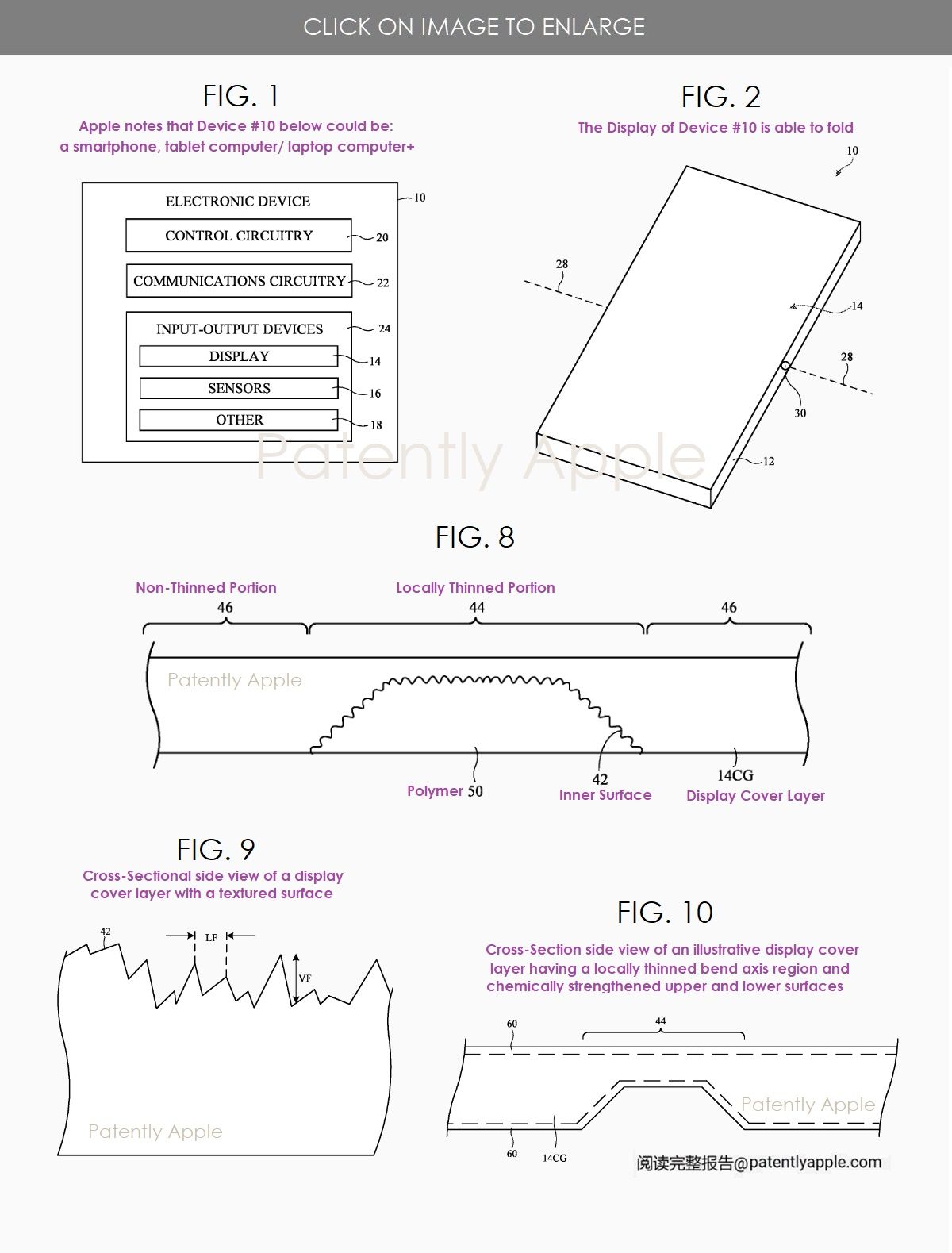 根据美国商标和专利局近日公示的清单,苹果获得了一项关于折叠屏的技术专利,介绍了一种在折叠处用化学方法制造纹理玻璃的方法,以防止玻璃破裂。