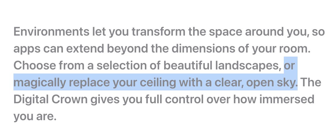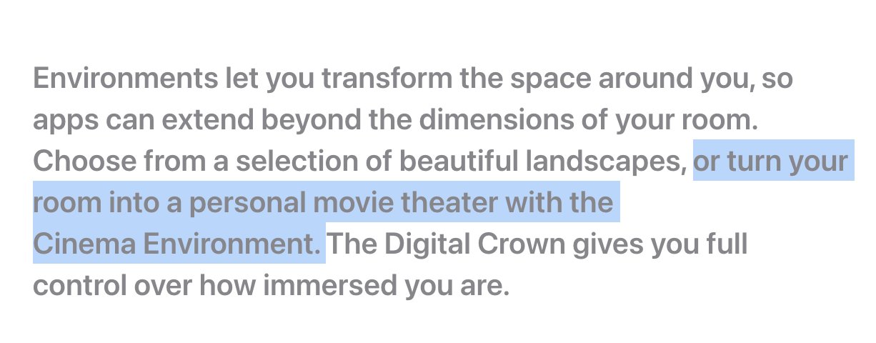 博主 @M1Astra 首先发现了这一变化,并指出苹果官方网站上关于 Vision Pro 的介绍也删除了对 “天空替换” 功能的描述,转而着重强调将房间变身私人影院的 “影院环境” 功能。值得注意的是,“影院环境”并非新功能,之前宣传视频中就展示过,只是苹果此前并未在文字介绍中提及。