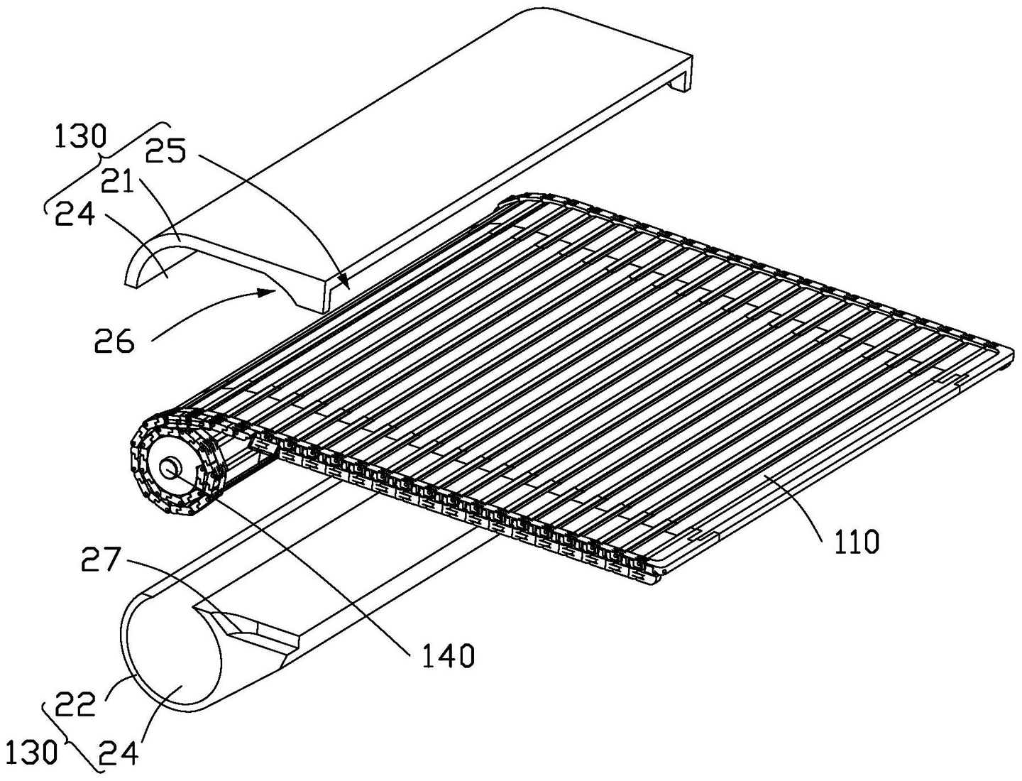 •相邻的支撑组件之间通过第一转动轴转动连接;转动组件与支撑组件通过第二转动轴转动连接,相邻的转动组件之间通过第三转动轴转动连接;转动组件可相对于支撑组件翻转并在第一及第二状态之间转换。