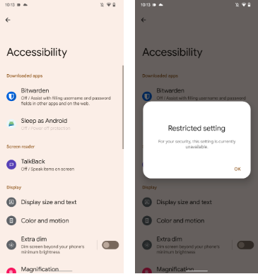 Android 13 对侧载 App 引入了新的限制,阻止用户授予他们使用无障碍服务的权利。鉴于许多网络钓鱼和恶意软件攻击是通过诱骗用户从应用商店外部安装 APK 来进行的,这可能会使不良行为者更难劫持毫无戒心的用户手机。