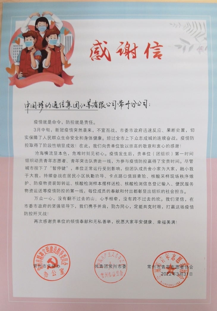 近日,常州市文明办、共青团常州市委、常州市青年志愿者协会联合发信,感谢江苏移动常州分公司青年团队舍小家为大家,持续奋战在疫情防控第一线的奉献和付出。