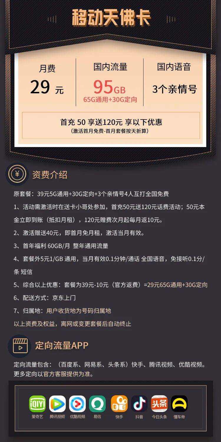 5、综合以上优惠:套餐为39元-10元(官方返费)=29元65G通用+30G定向