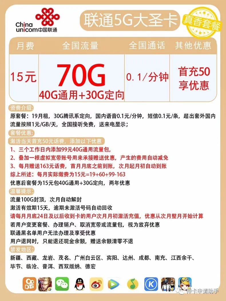 【不限年龄】联通5G大圣卡,15元40G通用流量+30G定向流量