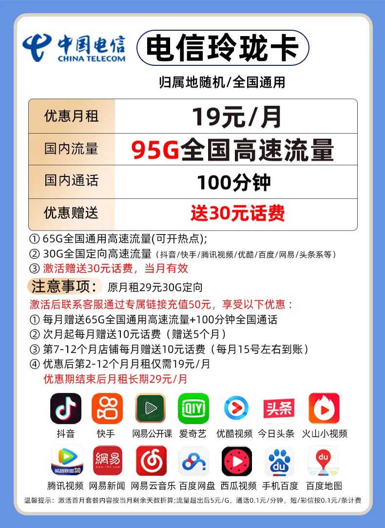 简介:宁夏电信玲珑卡19元95G全国高速流量不限速,100分钟通话