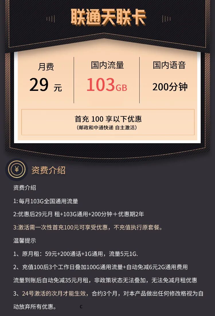 2:优惠后29元月 租+103G通用+200分钟+优惠期2年