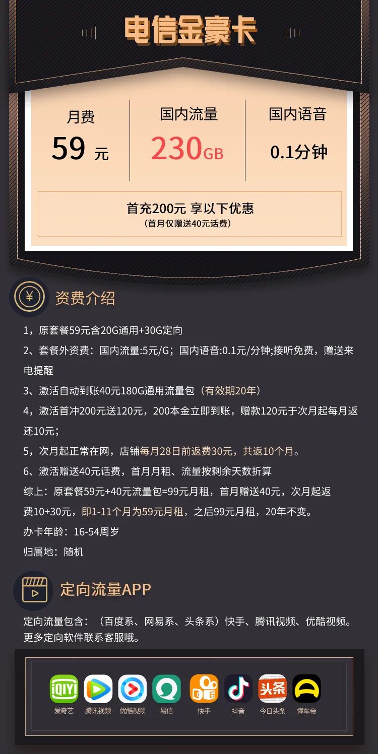 简介:河南电信金豪卡59元200G全国通用流量+30G定向流量,全程5G网速不限速
