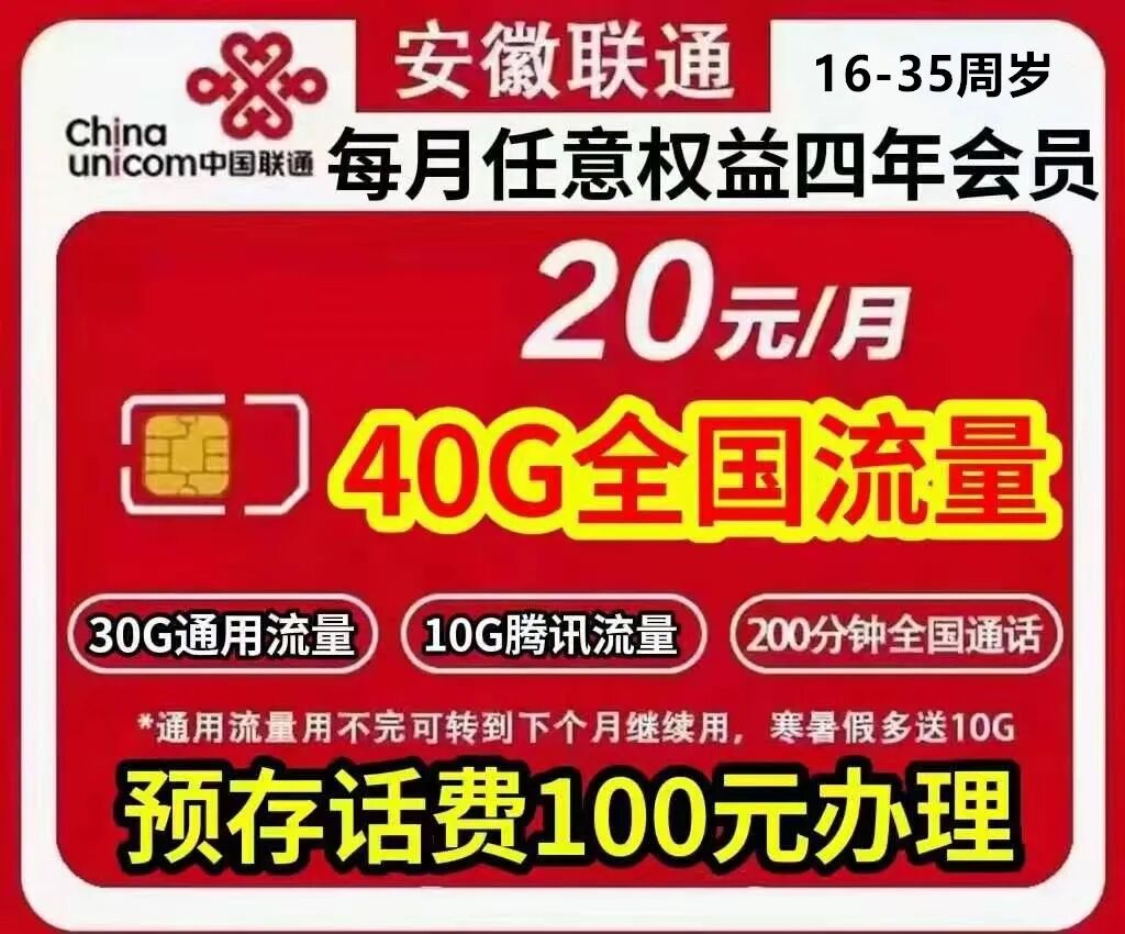 简介:联通沃派王卡20元40G(30G通用流量+10G定向)+200分钟免费通话,送4年热门APP会员